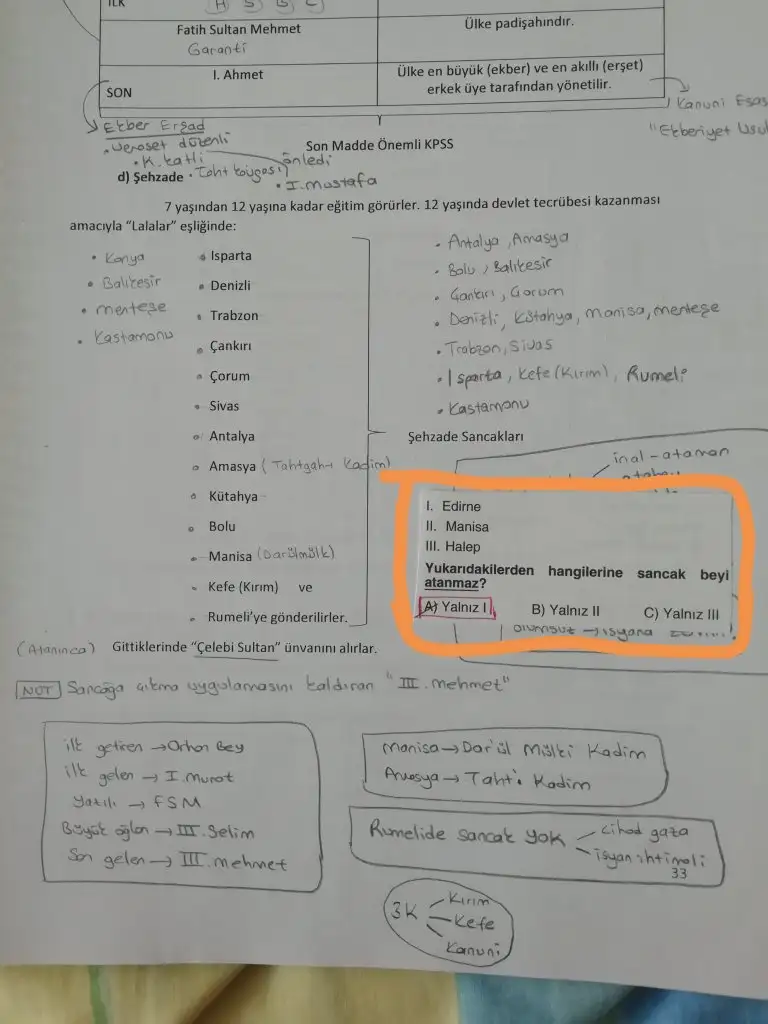 Burada notumun üzerinde turuncu ile çerçevelediğim soruda sancak beylerinin atanabileceği şehirlerle ilgili bir soru var. Ancak notumda görüyorsunuz şehzade başlığı altında birsürü şehir var ama orada soruda bulunan Halep yazmıyor. İşte eğer bu soru bu konunun bu kısmına aitse şehirlere Halep i de mi eklese bilemedim. Ya birde bu şehzade ile sancak beyi aynı şey midir? Ya bu sancak beyi nedir? Ayy bu sözel beni çok geriyor daha hangi soru nereye ait onu bile bir türlü bulamıyorum başım dönüyor sayısalın gözünü sevem bu nedir nolursunuz bi el atın