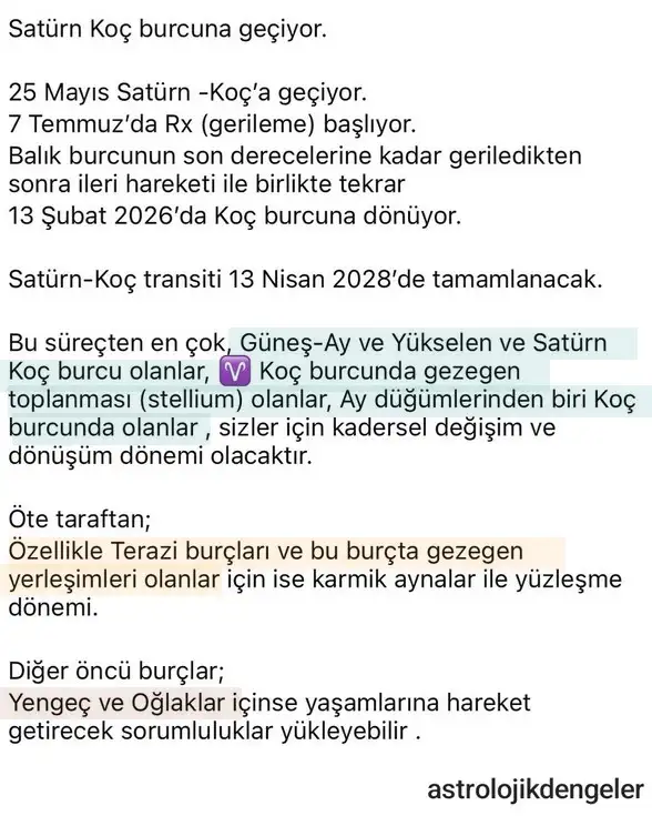 Satürn, Koç burcundaki transitiyle birlikte haritanızın 3. evinden geçmeye başlıyor. 3. ev; düşünce yapınız, iletişim şekliniz, öğrenme biçiminiz, yakın çevre ilişkileriniz, kardeşler, kuzenler ve kısa yolculuklar gibi konularla doğrudan bağlantılıdır. Satürn burada zihinsel süzgeçlerinizi, bilgi edinme yöntemlerinizi ve dış dünya ile kurduğunuz iletişim ağını yapılandırmak ister. Bu süreçte kelimeleriniz, düşünceleriniz ve bağlantılarınız daha ciddi, daha sorumluluk temelli bir hâl alabilir.