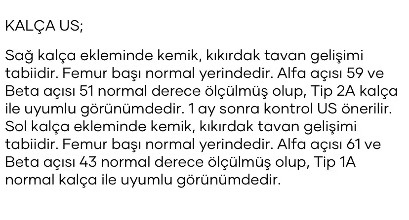 Sağda alfa açısı 59 derece beta açısı 56 derece ölçülmüştür.Solda alfa açısı 58 derece beta açısı 57 derece ölçülmüştür. Graf yöntemine göre Tip 2a kalça ile uyumludur. Sonografik duyarlılık %100 olmayıp klinik şüphe devamı halinde kontrolü ve tetkiki önerilir. Tip 1 a > 60 Tip 2a a 50-59 (ilk3 ay normal) sonra tip 2bTip 2c a 43-49 b 70-77Tip D a 43-49 b >77Tip 3 a < 43="" b="">77Tip 4 a < 43="" labrum="">