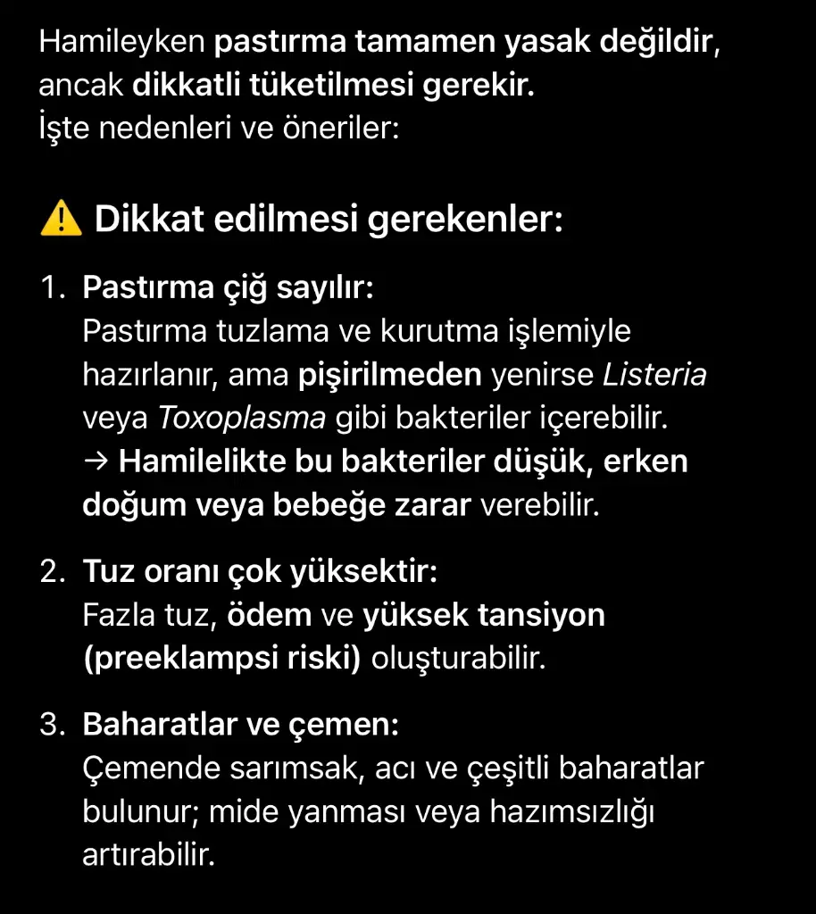 kız ciddi misin ben yedim iki dilim amaBebeğe geçmez ahahahaha ama sanırım yasaklı listede pastırma. Gerçi sucukta yasak ama ben bir kaç kere yedim