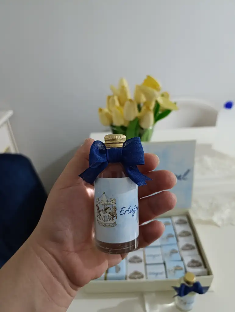 Ben kendim yaptım kolonya şişesi aldım içerisine sim ve kolonya üzerine de sticker tasarlayıp çıkardım ve çiçekle süsledimKizlar bebis icin hediyelik ne yaptirdiniz ya veya ne yaptirmayi dusunuyorsunuz