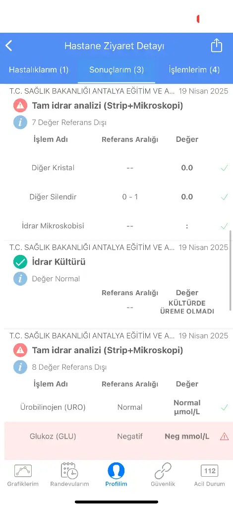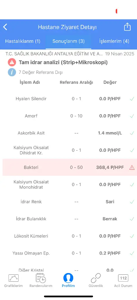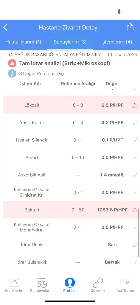 Perperişan atayım hatta 1. sonuç 2. sonuç diye. İlk bakteri 1000lerde çıktı idrar tahlilini yenilediler 300 lerde çıktı. Yine çok yüksek dedi. Belirtim de karın ağrısıydı bir an da karın ağrısı başlamıştı çok şiddetli sanki regl olmuşum gibi öyle öğrendim