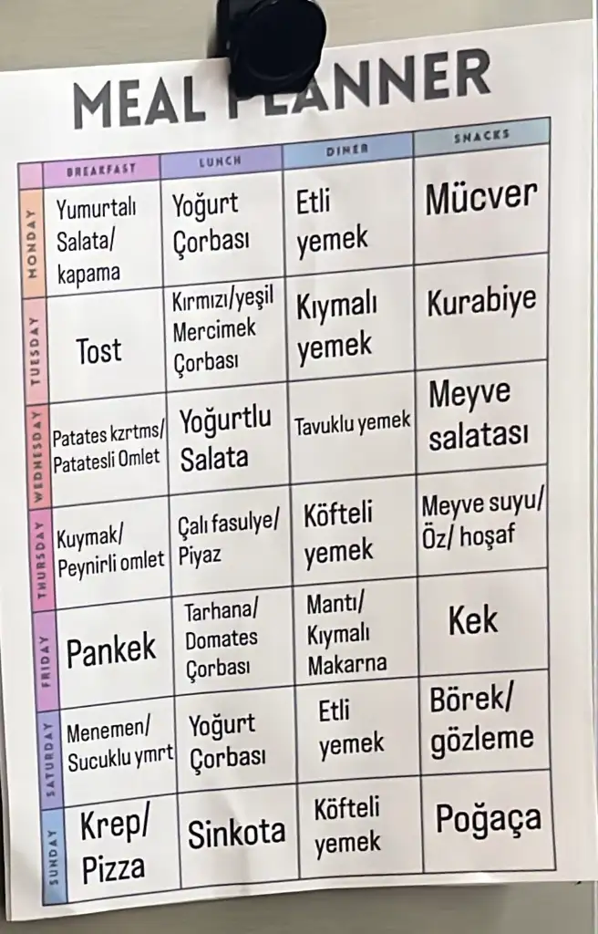 Çok güzel her gün uyulmasa bile takıldığında fikir oluyordur liste çocuklarda fikir veriyor ne güzelBenim için de hep yemek düşünmek bir derttir. Ama ben kahvaltıda daha zorlanıyorum ne yapsam diye çünkü çocuklar her gün bizim gibi haşlanmış yumurta yemeği kabul etmiyorlar. Ben de çocuklarla haftalık bir liste yapıp buzdolabının üstüne astım, oradan düşünmek kolay oluyor artık. 1 haftadır listeye uyuyoruz. Çocuklar da bana hatırlatıyor anne bugün tost yapacaksın der mesela kızım şimdi sabah uyanınca. Akşam yemekleri de mesela bugün Salı kıymalı yemek günüymüş, evdeki sebze durumuna göre ya biber dolması yaparım ya patates oturtma. Tabii ki her gün her gün sayfadaki yazılanları pişirmiyorum, eğer dünden bir yemek kalmamışsa fikir olsun diye bakıp yapıyorum. Genelde 2 günlük yemek yapmaya çalışıyorum ama bazen az artıyor o zaman ertesi gün öğlende çocuklara yediriyorum kalan yemeği. Aslında evde çocuk olmasa kek börek poğaça kurabiye asla pişirmem ama onlara da aktivite oluyor beraber giriyoruz mutfağa yoğuruyoruz çırpıyoruz vs. Liste fikir amaçlı bir liste, yoksa dediğim gibi her gün her gün bu kadar çok şeyi bir arada yapmıyorum tabii ki. Ya da aklıma başka bir yemek yapmak gelir onu yaparım aaa bugün illa kıymalı yemek yiyeceğiz diye bir zorunluluk yok tabii kive yaz olduğu için artık çorbayı akşam hiç içmiyoruz zaten, öğlen çocuklar için yapıyorum sadece.