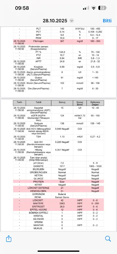 Onları benden de istedi canım. 5 tüp kan aldılar bi de idrar tahlili. Ve aylardır geçmeyen idrar yolu enfeksiyonum eşliğinde yine doğuma gidicem🫠🫠