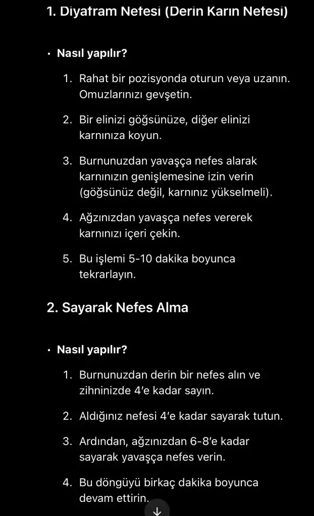 Cok tesekkurler canim ben de deneyeyimCanım korkmmaa ben de zaten anksiyete kaynaklı nefes açlığı var iyice panikliyorum ben de ama sonrada diyorum tamam geçicek. Nefes egzersizleri işe yarayabilir. Ben kötü hissedince saatten nefes egzersizleri yapıyorum çok iyi geliyor