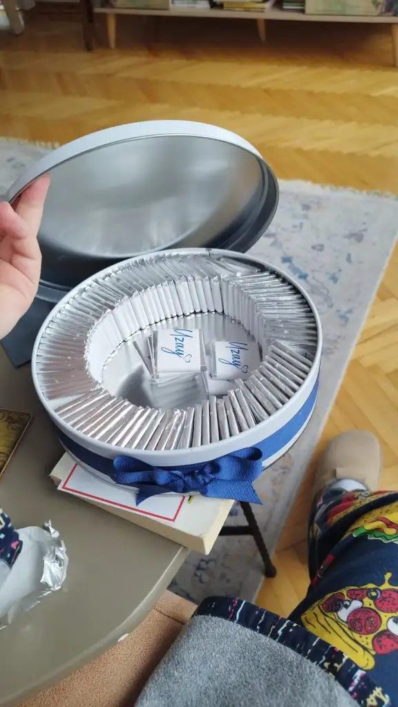 yaaa süpermişş ciddennnKızlaaarmaya91 çikolatalarımız geldi. İki gün önce verdim siparişi şimdi geldi. Yüz tane sütlü çikolata. Metal kutu. Tadına hemen baktım kötü değil taze çikolatalar gayet güzel. Trendyolda kakaoağacı diye bir satıcıdan aldım. 480 TL tuttu.