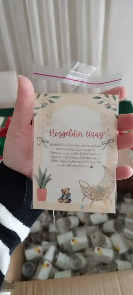 Kendim hazırladım canım canva diye bir program. Vaktin olursa sen de yapabilirsin çok pratik ve istediğin gibi yapabiliyorsun. Sonra da bizim tanıdık bir kırtasiyede baskı yaptırdım kartlara. Naylon poşetler aldım bir de trendyoldan daha uygun fiyata geldi. 🥰