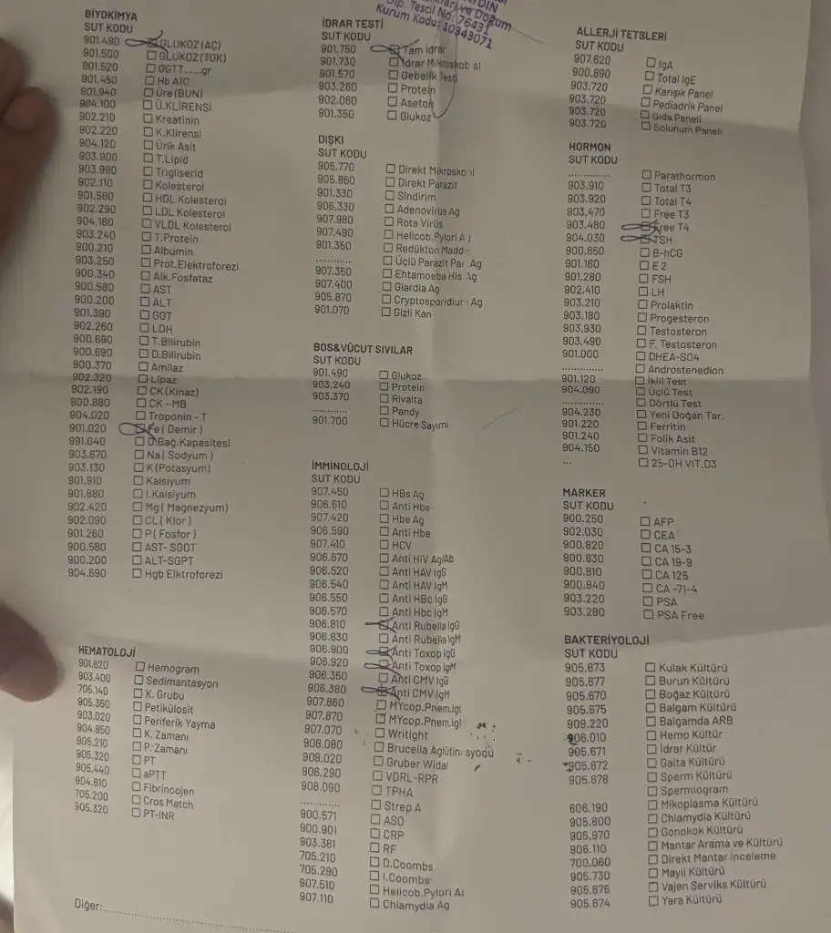 Söyledim doktorumun istediği tetkikler var diye bizde olanların hepsini yapalım dedi. İdrar tahlili falan verdim. Olmayanlara da devlete randevu aldım.Sağlık ocağı kadındoğumun istediği değerlere bakıyormuymuş