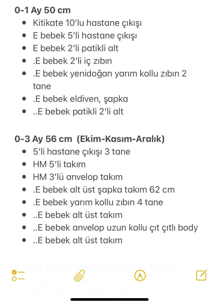Kızımda aldıklarımı not alıyordum unutmamak için. Baktım duruyormuş hala. 50-56 cm olanları bu kadar almışım kızım 3 kilo doğduğu için uzun süre giydi bebeğin kilosuna göre artırıp azaltmakta fayda var bence. Bir de hediye gelenler de oldu çoğunu açmadık bile fazla fazla yetti bunlarBende kaçar tane ne alacağımı bilmiyorum kısa kollu takımda hiç yok sanki sadece zibinlarda var sanki hiç göremiyorum
