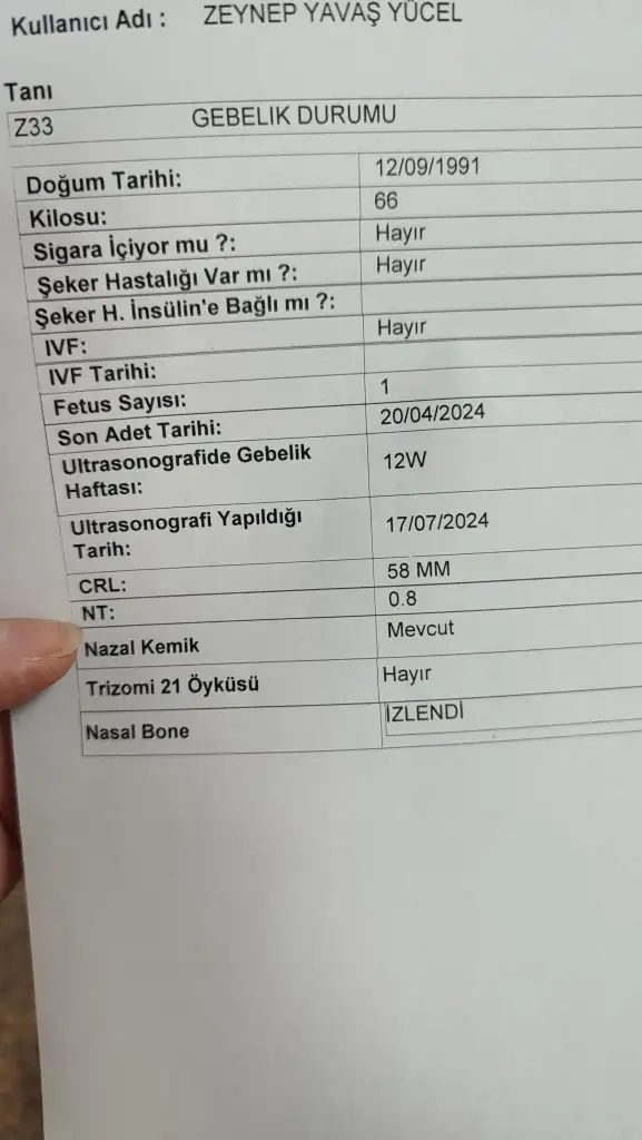 Cnm NT yazan yer ense kalınlığı,nazal kemik dediğinde burun kemiği oluyor.2li raporda yazıyor geneldeCanım bu bilgiler nerde yazıyor ne olarak geçiyor benim anladığım sadece crl ve ga:-)