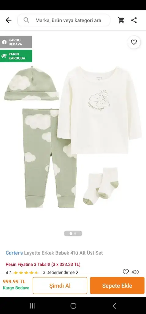 Oy çok tatlıBu da benim poposu bulutlu aldığım takım.Carters'da çok güzel takımlar var. Bebeğe çok gelmeyeceğini bilsem bir de mevsimleri hesaplayabilsem belki 2 yasina kadar bir sürü şey alacağım.