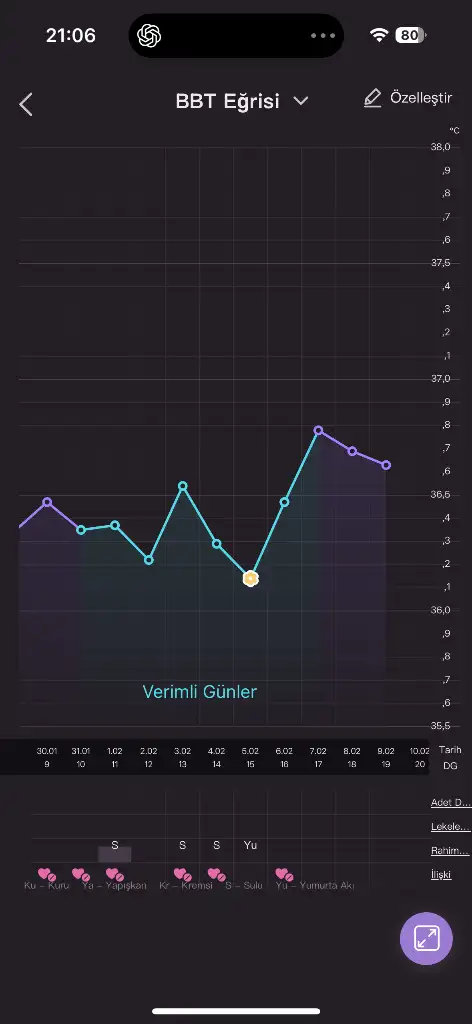 Bakın mesela şuan böyle, yumurtlama oldu ve yükseldi aynı seyirde devam ediyor. Isı kişiden kişiye çok değiştiği için önemli olan aynı civarda gidip gitmediği 0,5 eksi ya da artı olması normalmiş ben bu şekilde bakıyorumKaç çıkıyor peki? Gebelikte yüksek mi kalıyor
