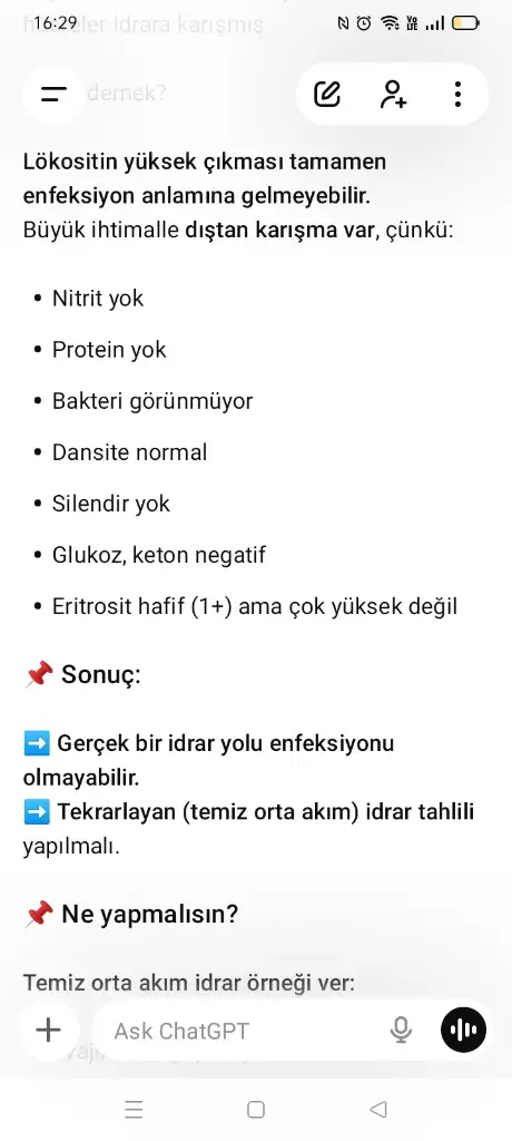 Kızlar iyi akşamlar. Dün sağlık ocağı izlem günümdü. İdrarda lökosit hpf 40 çıkmış. Ama diğer değerler normal. Akıntı, koku, yanma vs yok. Çok su içiyorum. Çokça tuvalete çıkıyorum. Salı, Çarşamba, Perşembe hastanede yattım. Oradaki test temiz çıktı dediler. Anlam veremedim. Chatgpt ye yorumlattım böyle dedi. Anlayan var mı acaba?