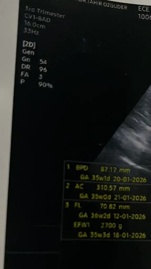 Bebek 2 hafta öndeydi. Şeker diyeti yapıyorum şu an haftasıyla uyumlu. Boyu uzun gözüküyormuş. 7 cm dedi uyluk kemiğine ne demek bilmiyorum artık. Kilosu da 2400 dedi.