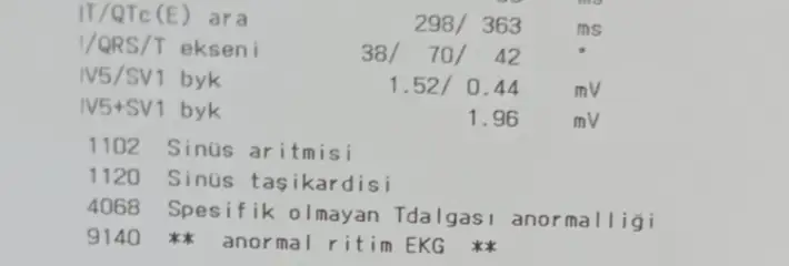 Geçmiş olsun, üzüntüyle çok alakası var ne kadar mutlu olursak o kadar iyi bizim için benim EKG de böyle çıktı, normalde rahatsız olmuyorum ama ne zaman üzülsem hemen hissediyorum, kardiyolojiye görünmek en doğrusu olurBenim de busene özellikle kalbimde çarpıntı batma oluyordu hamilelikte biraz geçti gibiydi 2 haftadır yine oldu biseylere üzüntüyle alakası varmi bilmiyorum hatta geçen acile gittim batıyor diye EKG çekildi bisey çıkmadı şükür ama hamile olunca biseyde verilmedi şimdilik çok yok ama korkuyorum olacak diye Bi kardiyoloji ye gitmeyi düşünüyorum doktoruma görün dedi