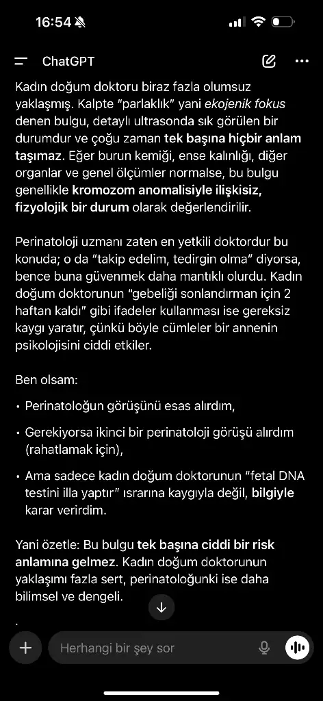 21.haftada detaylı ulturasona girdim. Perinatoloji doktoru kalpte parlaklık gördüğünü ama çocuğumun burun kemiği ve ense kalınlığının normal olduğunu, tedirgin olmamam gerektiğini söyledi ve takip edelim dedi. Kendi kadın doğum doktorum bana ısrarla fetal yaptır doğumda bi sürpriz olmasın, bu durum geçici bi durum değil ki takip ediyosun diyip duruyor. Hatta bi sorun çıkarsa düşünmen ve gebeliği sonlandırman için 2 haftan kaldı dedi pazartesi günü. Bayağı araştırıp video izledim. Bu durumun geçici olabileceğini çoğu doktor söylüyor. Doktorumun beni sürekli tedirgin ettiğini ve olumsuz konuştuğunu farkettim.