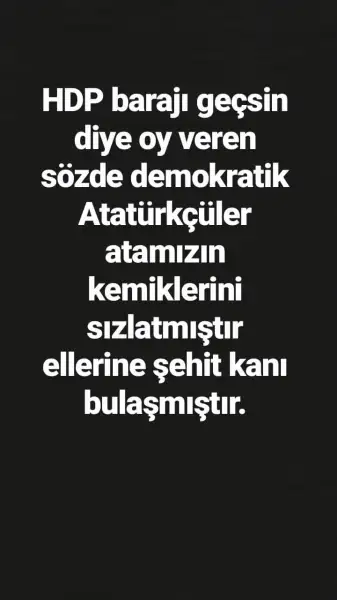 CHP ve diğer partilerin kaybetmesinin belki en büyük sebebi bu. Şehitlerin kanını çiğneyip geçtiler HDPKK adlı terörist partisinin sözde lideri Selahattin Demirtaş özde sahibi abdullah öcalan adlı köpeği desteklediler. Kendi içlerinde ki seslere kulak vermediler. Sözde kurdistan kurmak isteyen Vatan haini şerefsizlerin ekmeğine yağ sürdüler. Yazıklar olsun HDPKK ya oy verenlere. Keşke diğer partilere verseydiniz oyunuzu da o adi parti ye vermeseydiniz.