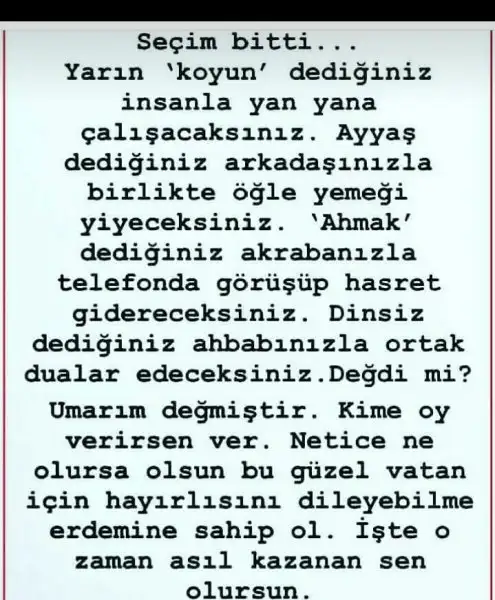 Bir üye yazmıştı eşim başka partiye verdi oyunu ,ben Ak partiye ,dargın bana gibisinden birşey yazmıştı ,kim olduğu aklımda değil.Bu da bir sorun esasında .Hadi arkadaş ,komşu aynı partide olmasa tartışsa neyse,karı-koca arasında parti tartışması ,benim istediğin partiye oy vereceksin oyunu baskısı da çok var.Özellikle erkekler.Eşine düşünme şansı vermeyen ,fikrini sormayan erkekler de var.Benim eski komşum önceki seçimde Ak partiye vermek istiyordu oyunu,eşi HDPye ,eğer Ak partiye verirsen oyunu sütüne vicdanına demiş.Bu kadın eşiyle sorun yaşamayı mı seçer,yoksa oy vermeyi mi?Aynı şekilde çoğumuz izlemiştiriz Belkıs Akkale'nin muhtar adaylığına girmek için eşiyle mücadele etmesini konu alan filmini.Hani sabah biri yazmıştı,seçme -seçilme hakkını Atatürk verdi diye.Eş izin vermeyince Atatürk seçme seçilme hakkı vermiş ne fayda...