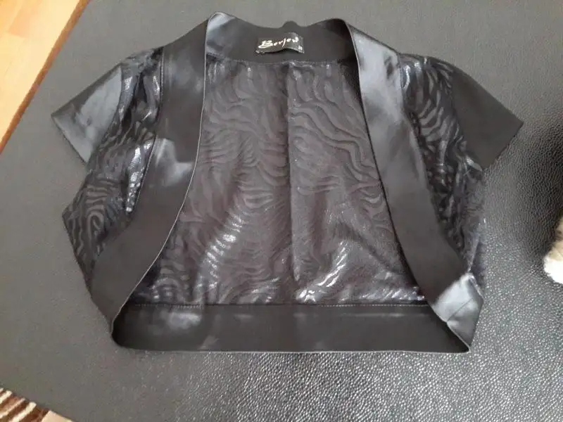 SİYAH SATEN ELBİSE KUMAŞI İNCE SATENLERDEN DEĞİL BOLERSU İLE BİRLİKTE ELBİSENİN ÖNÜNDEKİ KUMA DETAYINDAN BOLEROSU RESİMDE RENGİ GRİ GİBİ CIKMIS AMA AYNI ELBİSEYLE 36 38 BEDENE OLUR 25 TL