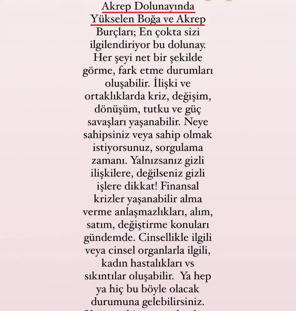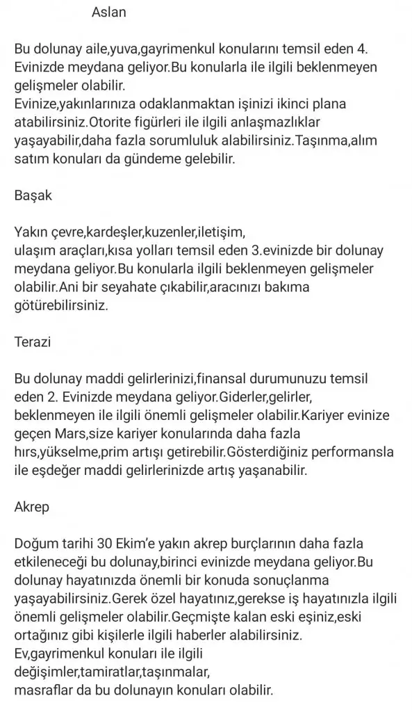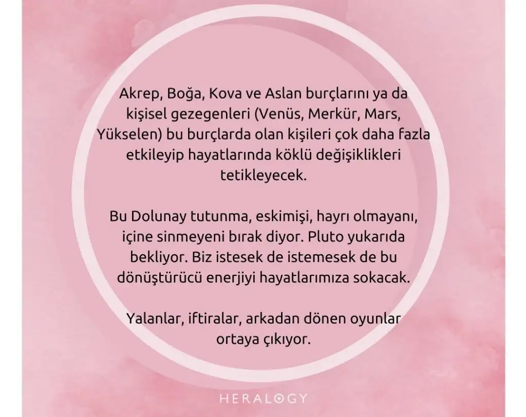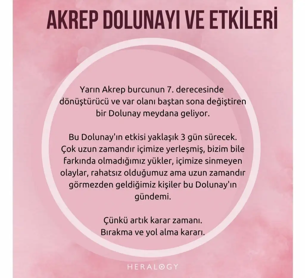 Dolunay dönemlerinde, yapbozdaki eksik parça bulunup resim tamamlanır ya da yapbozu tamamlamaktan vazgeçilir. Kimi zaman da geride kalması gereken kişi ve durumlarla ilişkiler kesilir. Bir tür yüklerden arınma ihtiyacı ortaya çıkar. Ay hareketleri, özellikle dolunaylar, ruhun olgunlaşma sürecini destekleyen göksel bilginin Dünya’ya açıldığı evrelerdir. Akrep burcundaki bu dolunayın gerçek mesajını anlamak için değişim, dönüşüm, sabır, dayanıklılık, derinlik, yoğunluk, gizem, şifacılık, ölüm, reenkarnasyon vb. sayısız başlık irdelenmelidir.