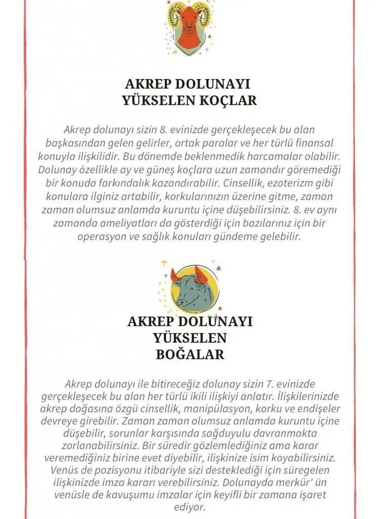 Akrep Dolunayı sizin ikinci evinizde gerçekleşecek. Maddi alanlarınıza, yatırımlarınıza, birikimlerinize ve finansal konylarınıza dair gelişmeler yaşayacaksınız. Bu konularla ilgili farkındalıklarınızın artacağı ve yeni kararlar alarak ani hamleler yapacağınız bir dönem olacak. Ayrıca bu alanlarda rahatsız olduğunuz her ne varsa bu süreçte noktalayabileceksiniz.