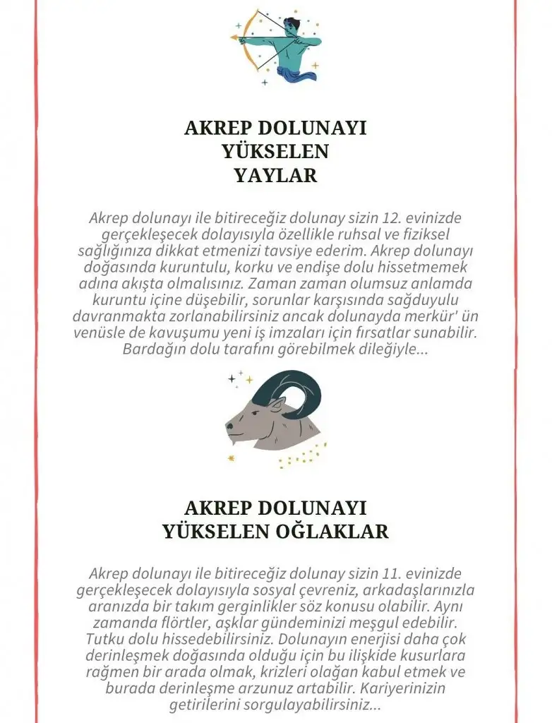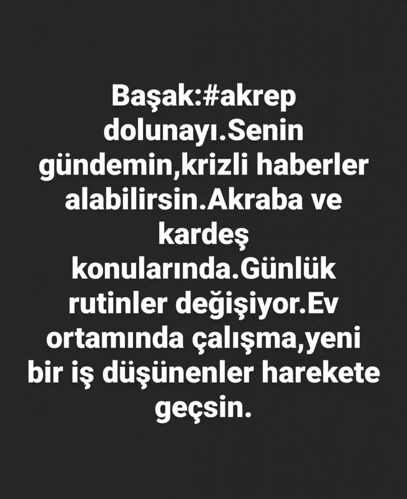 Akrep Dolunayı sizin 1. evinizde gerçekleşecek. Bu süreçte sizden gizlenen, saklı kalmış her ne varsa önünüze gelecek. Gözünüzü ve kulağınızı dört açın. Hayatınızla ilgili keskin kararlar alacak ve rahatsız olduğunuz, kısıtlanmış hissettiğiniz her durumu sonlandıracaksınız. Bu hafta sizin için oldukça kritik ve yoğun bir hafta olacak. Ayrıca sezgilerinizin de oldukça yoğun olduğu etkiler altındasınız.