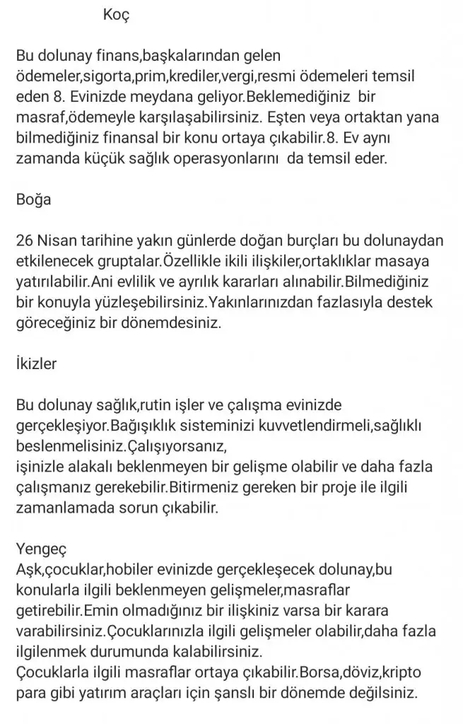 Haftanın gündemini parasal konular oluşturuyor sevgili Koç burçları... 27 Nisan'da Akrep burcunda gerçekleşecek Dolunay'da yatırımlar, kredi başvuruları gibi konular önem kazanabilir. Aniden para kazançları elde edebilirsiniz. Ancak maddi konularda yaşadığınız stres özel hayatınıza olumsuz yansıyabilir. Partnerinize veya ailenize karşı sert cevaplar vermemeye özen göstermelisiniz.