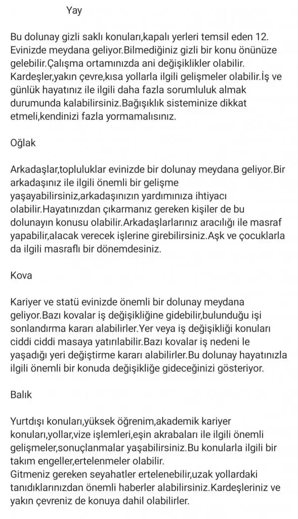 Dolunay sizin 6. evinizde gerçekleşecek. Çalışma alanınıza dair birtakım değişiklikler söz konusu olabilir. Çalıştığınız yerdeki kişilerle ilgili bazı rahatsızlıklar duyabilir ve bu konularda yeni adımlar atabilirsiniz Ayrıca çalışma alanınızda arkanızdan çevrilen ya da gizli kalmış bazı konuları öğrenebilirsiniz. Sağlığınızla ilgili de dikkat etmeniz gereken bir dönem söz konusu olacak.