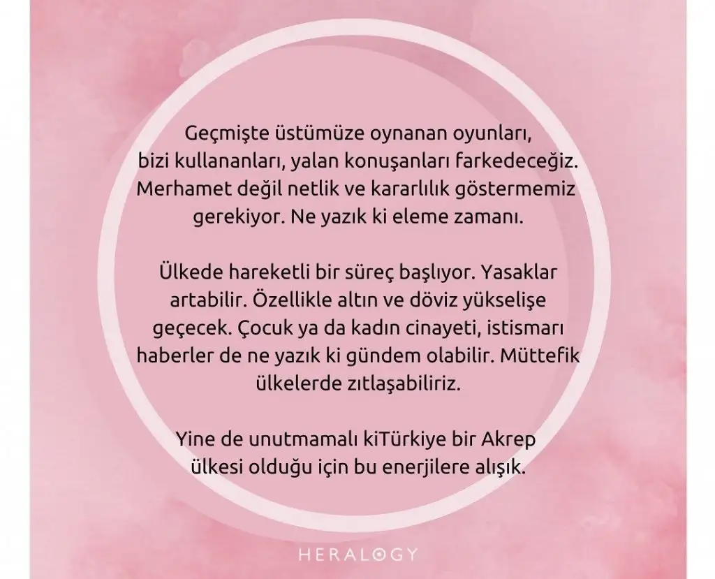 Kendinizi ne zaman, kime karşı, hangi durumda savunmasız ve güçsüz hissettiğinizi keşfetmek zorundasınız. Akrep Dolunayı’nda gerçek bir tamamlanma yaşayabilmek için etkilendiğiniz konuları dönüştürmeniz gerekir. Kabullenemediğiniz, çatışma yaşadığınız alanı temizlemek için ilhama açık olun, sezgilerinize güvenin. Gereken bilinç aşamasını yaparak seçimsiz, tarafsız bir bilince ulaşma yolunu bulacaksınız.