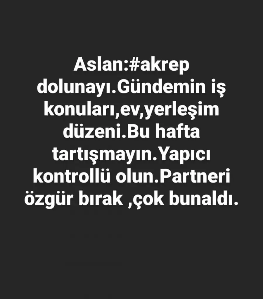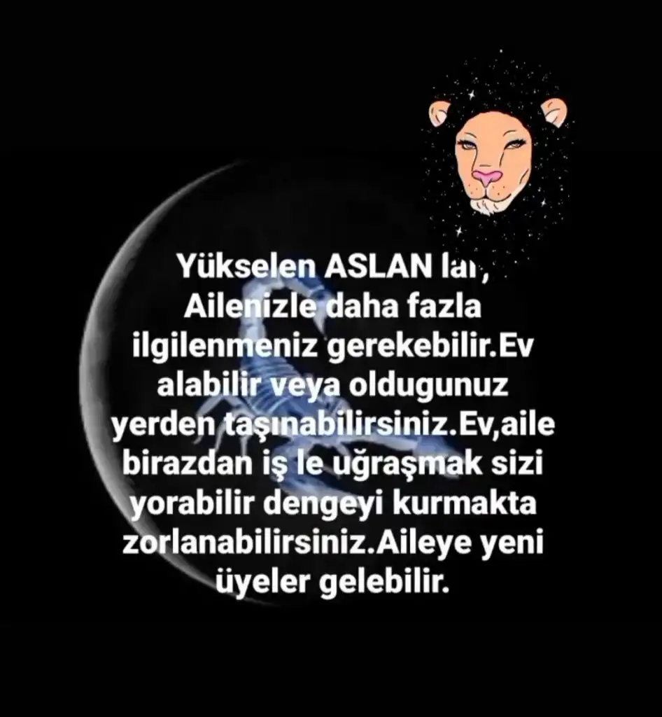 Kariyeriniz konusunda yaşadığınız kaygılardan kurtulmak için en ideal tutum, ailenizle birlikte zaman geçirmek ve iletişimde kalmak olabilir. Otorite figürleriyle gerilim yaşamadan ilerlemek istiyorsanız görev ve sorumluluklarınız konusunda denge ve ölçüyü siz belirleyin, ancak pek çok Aslan içe kapanıp kendi yuvasına çekilmek ve yalnız kalarak dinginleşmek isteyebilir; uygundur. Bu inzivayı iç huzurunuzu tesis etmek için kullanacaksanız sorun yok demektir. Kendinizi güçsüz ve yetersiz hissetmenize neden olacak bir ruh halini beslemeyin. Mekan değişikliği, taşınma ya da seyahat etme arzularınız tetiklenebilir.