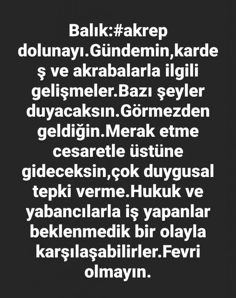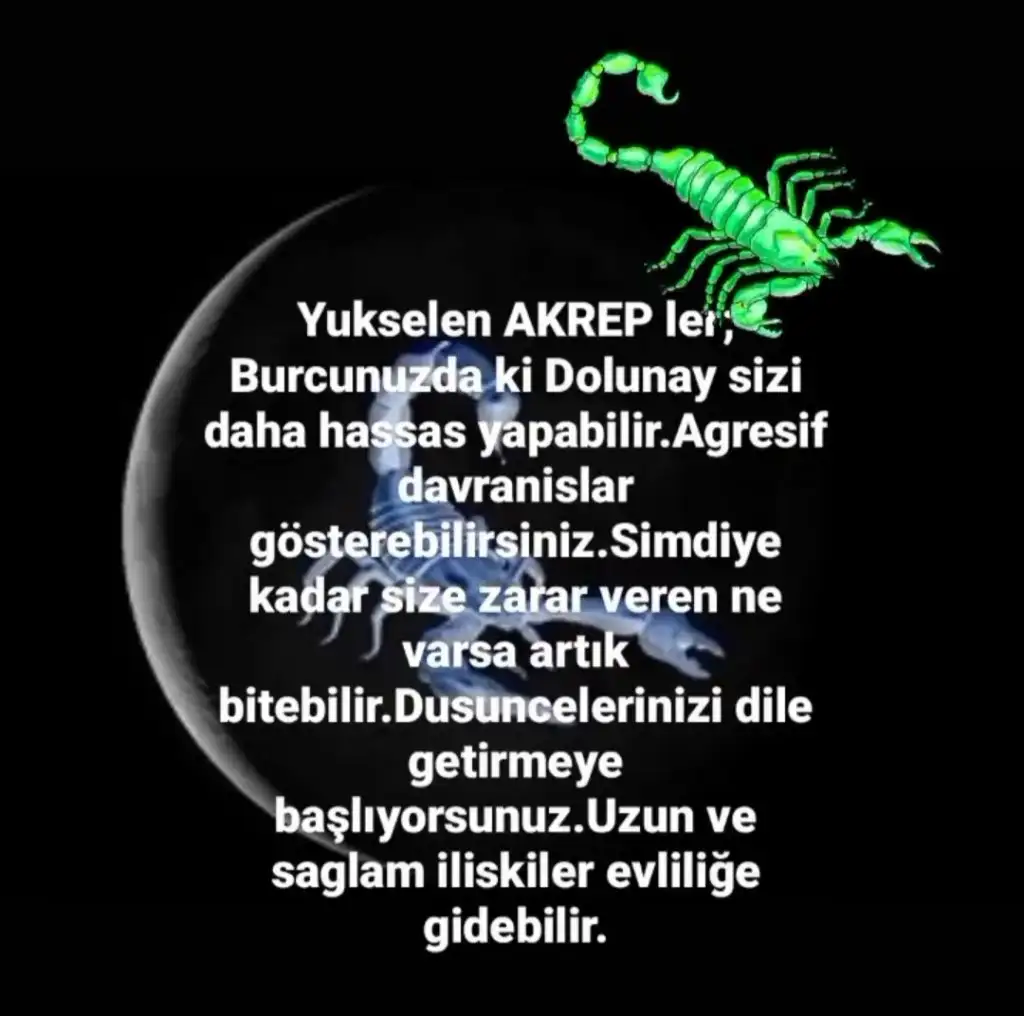 Dolunay burcunuzda gerçekleşiyor sevgili Akrep burçları... Hedeflerinizi, isteklerinizi gerçekleştirme konusunda sizden kararlısı ve güçlüsü yok. Öte yandan ilişkilerde eleştirirken fevri hareket edebilirsiniz. Bitişler yaşamamanız için gerilim yaratacak davranışlardan uzak durmanızda fayda var. Kariyer ve iş konularında ise stresli bir dönem. Patronlarınızın istekleri altında boğulabilir ve çalışma ortamınızda yoğunluk yaşayabilirsiniz.