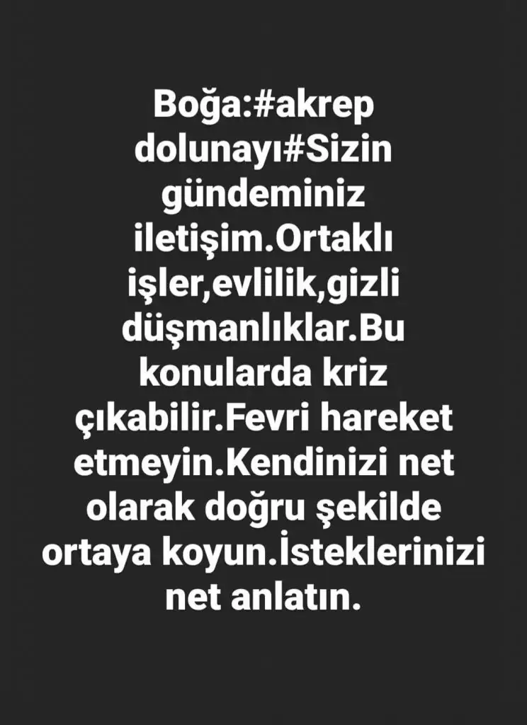 Sevgili Boğa burçları Akrep Dolunayı sizin 7. evinizde gerçekleşecek. Bu Dolunay sürecinde ilişkilerinize, evlilik ve ortaklıklarınıza dair bir takım farkındalıklar yaşayabilir, gizli kalmış konularI öğrenebilirsiniz ve bu konular ile ilgili birtakım kararlar alabilirsiniz. Hyatnızda özellikle de bu konular ile ilgili rahatsız olduğunuz bazı durumları sonlandırabilirsiniz.
