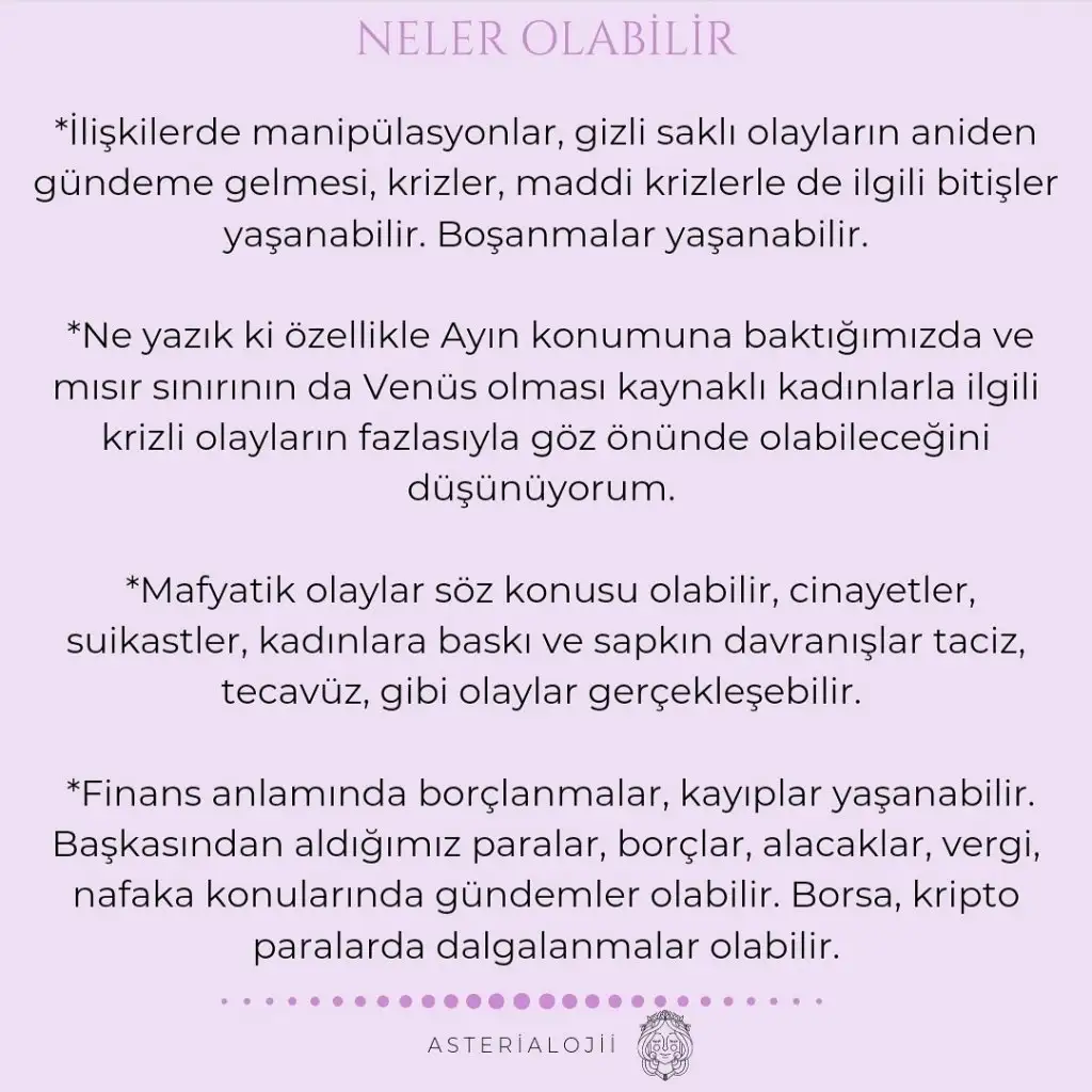 Akrep dolunayı sizin 8. evinizde gerçekleşecek. Para konularında alışverişleriniz yoğunlaşabilir ve bankalar ve mahkemelerle ilgili gündeminizde devam eden süreçleriniz varsa bu konulara dair farkındalıklar yaşayabilir ve birtakım kararlar alabilirsiniz. Bu konularla ilgili içinize sinmeyen, rahatsız olduğunuz durumlar varsa bunların son bulması için adımlar atacaksınız. Ayrıca sezgilerinizin çok kuvvetli olacağı bu dönemde spritüel konulara yönelmek isteyebilirsiniz.