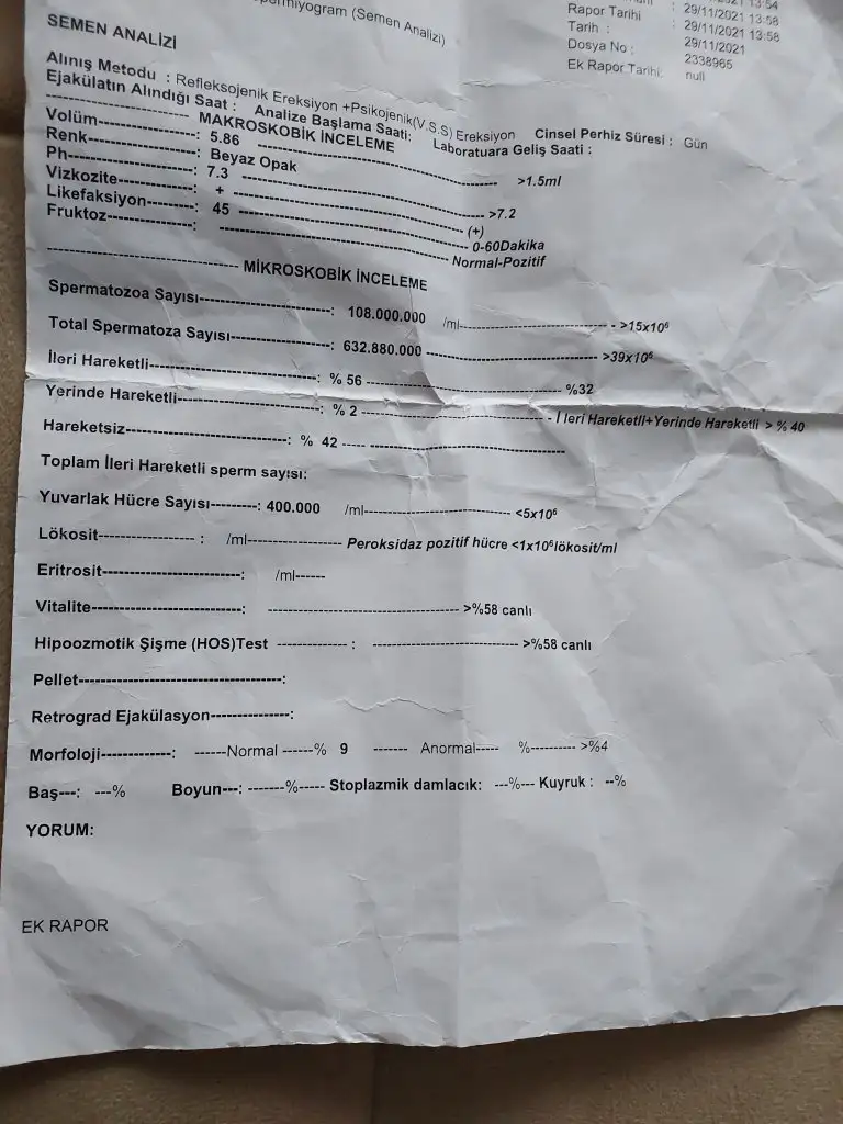 İleri hareket %56, sperm sayısı 108 milyon, total sperm sayısı 632 küsür milyon morfoloji %9 bize sonuçlar çok iyi demişti doktor birde anlayanlar baksın bakalımKuzum bizim yarıda kaldı sen baktın mınsprem testine ben dün biraz araştırdım bizim kinin başlıkları çok oynuyormuş ondan %8 cıkmıs