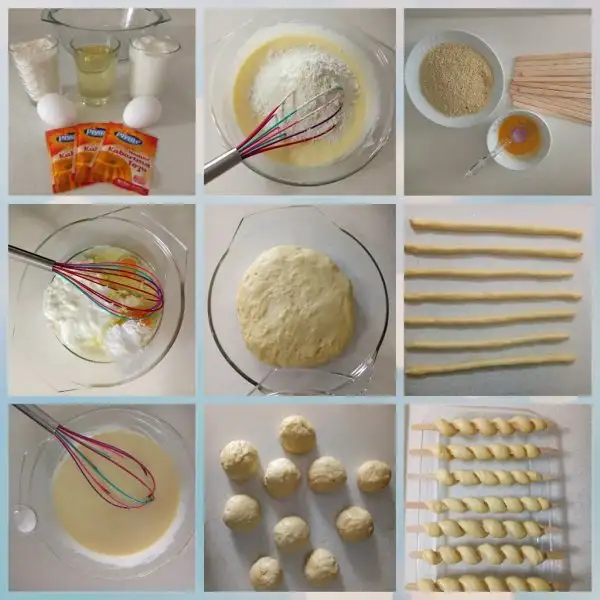 Dinlenen hamurdan bezeler yapıyoruz. Bu hamurdan yaklaşık 25 beze çıktı. Sonra bezeyi elimizle yaklaşık 30 cm uzunluğunda çubuk gibi yuvarlıyoruz. Dolamak için çöpşiş de kullanabilirsiniz ama ben bu çubukları tercih ettim.
