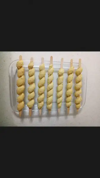 Alt kısımdan başlayıp dolaya dolaya bitiriyorsunuz hamuru. Burdaki püf nokta hamuru çubuğa doladıktan sonra yere temas ettiriyoruz ki altı düzlenmesin.