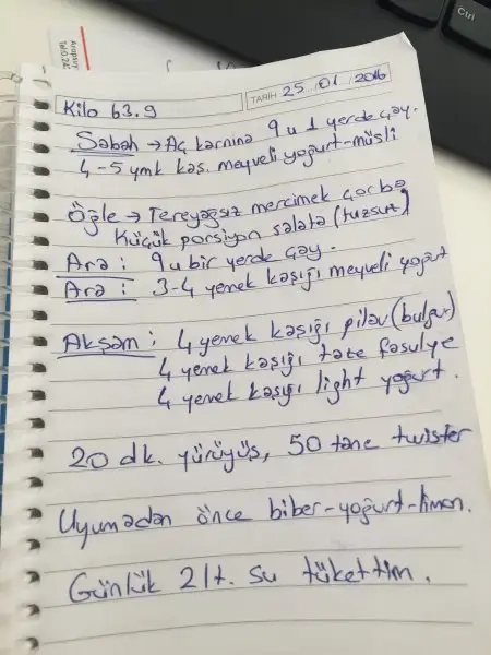 çok güzel ya defter işi süper bi fikir bunu bende uygulamaya alacağım :) keşke senin gibi verebilsem kiloları ama bende dıyet arkadası bulacagım ve hemen baslayacagım ınsallah :) takıpteyım :)