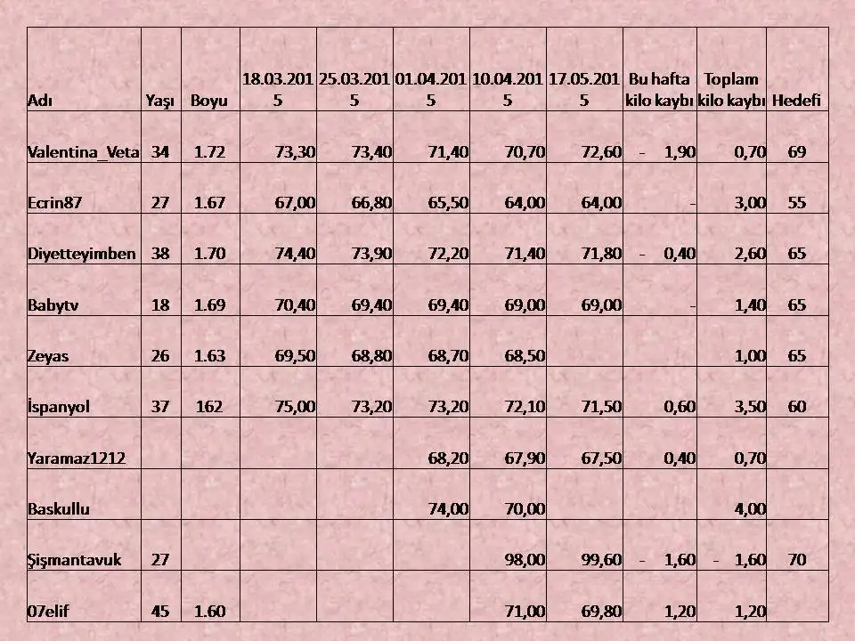 ay yok Valentinacım töbe dee71,8 kg çıktım bu sabah ben. geçen haftaya göre +400 gramım