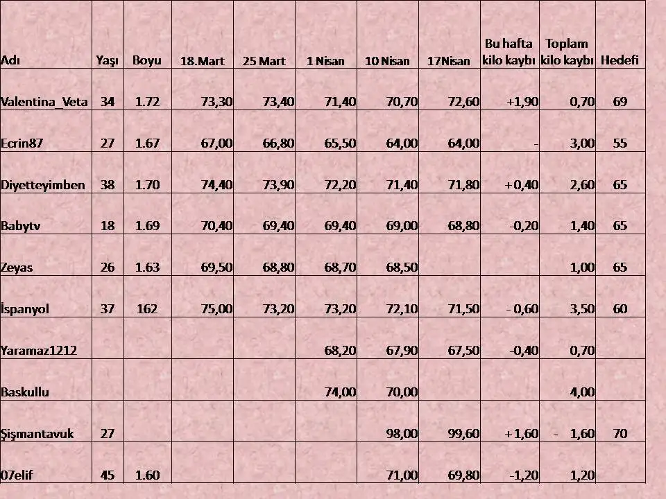 Bu cuma yapılmadı yaaa.bugun herkes sana özelden göndersin bilgilerini.yap sen de.valentina belki internete giremiyordur.sen baştan yap.ya da eski sayfalardan bulabilirsen ordan boy kilo bul.ben benimkini vereyim.169 boy.başlangıç kilosu 72 idi sanırım. Bu cuma 68 oldum.sen en iyisi sayfalara bak tabloyu ara.hatta ben de bakayım.bulursam söylerim sana.:))