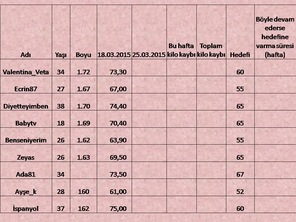 Kizlar cok azimli gordum bizi,sayfa da baya kalabaliklasti, bu isin sonunu getirelim insallah.ben ilk 2 gun 1.5kg vermistim sonra pazar gunu misafirim vardi,kek ve makarna yedim,700 gr ini aldim.4 gun gecti bende 100 gram eksilmedi yaaa, neden boyle olduuuuu