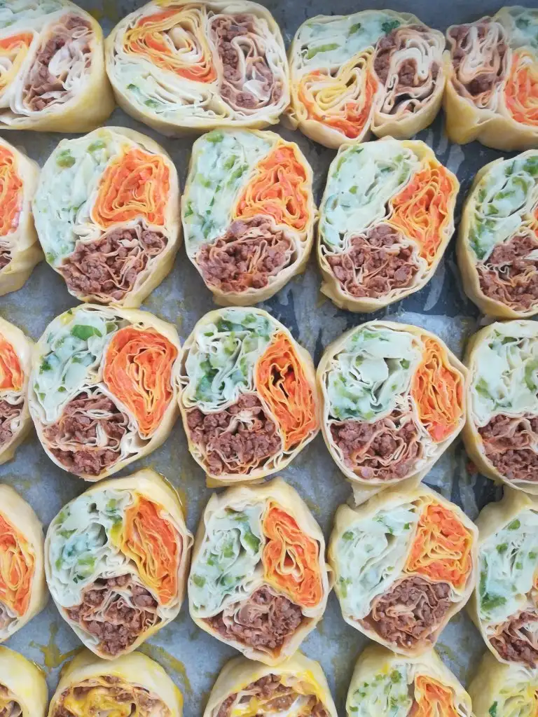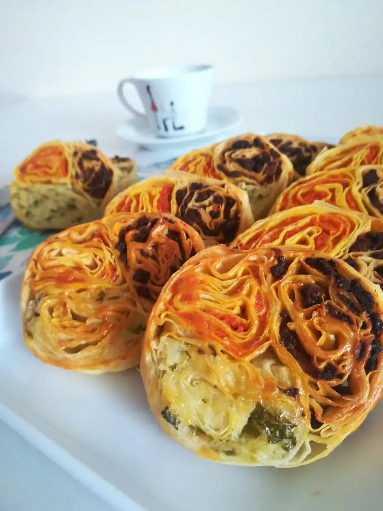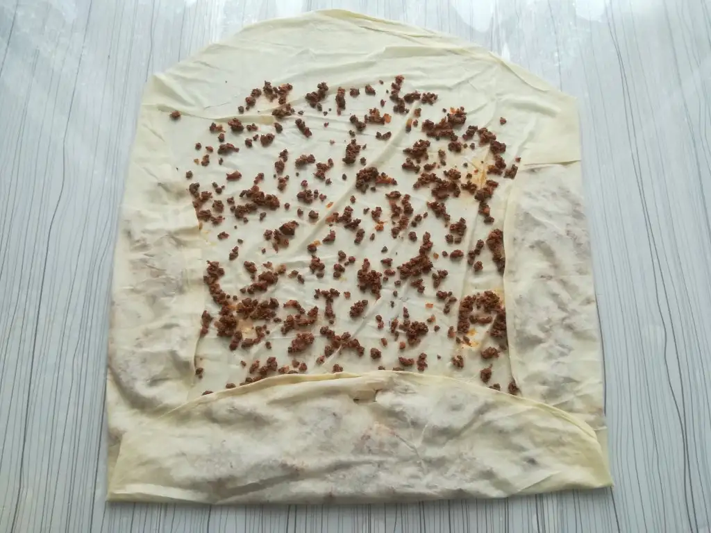 Önce yufkayı yağlıyoruz sonra harcı içine yaydıktan sonra 3 köşesini de katlayıp rulo yapıyoruz.