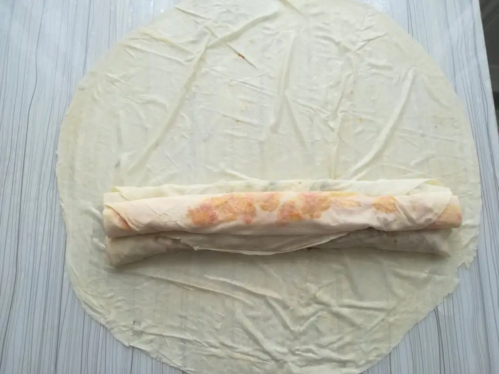 En son kalan yufkayı da yağlayıp rulo olan yufkaları ikisi yan yana biri üstlerine gelecek şekilde koyuyoruz ve iç harç konmuş gibi onu da yanlardan katlayıp rulo yapıyoruz.