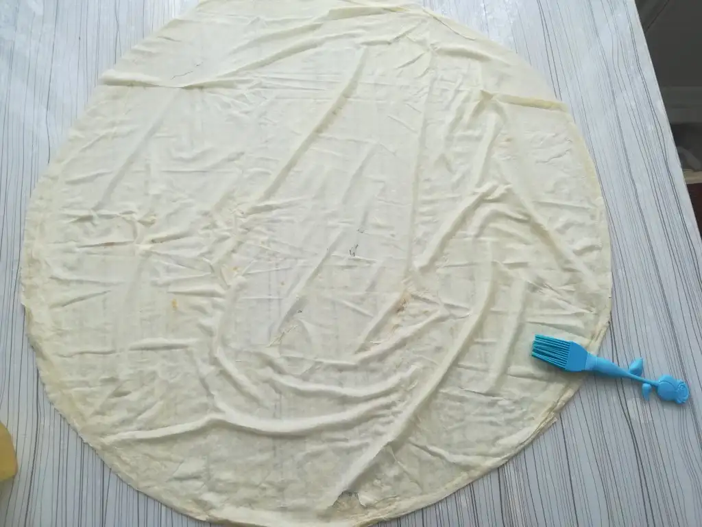 İç harçlar bitti şimdi sırada yufkaları yağlayıp, bu harçları yufkaların içine yatmakta.