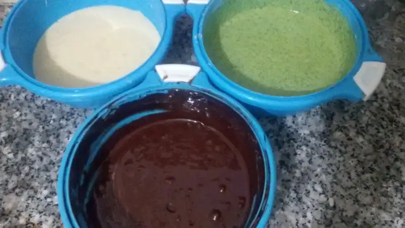 Elenmiş unu ve kabartma tozu vanilyayi da ilave ederek karıştırıyoruz. 3 eşit parçaya boluyoruz. Biri sade, biri kakaolu, digeride ıspanaklı olmak üzere 3 karışım elde ediyoruz