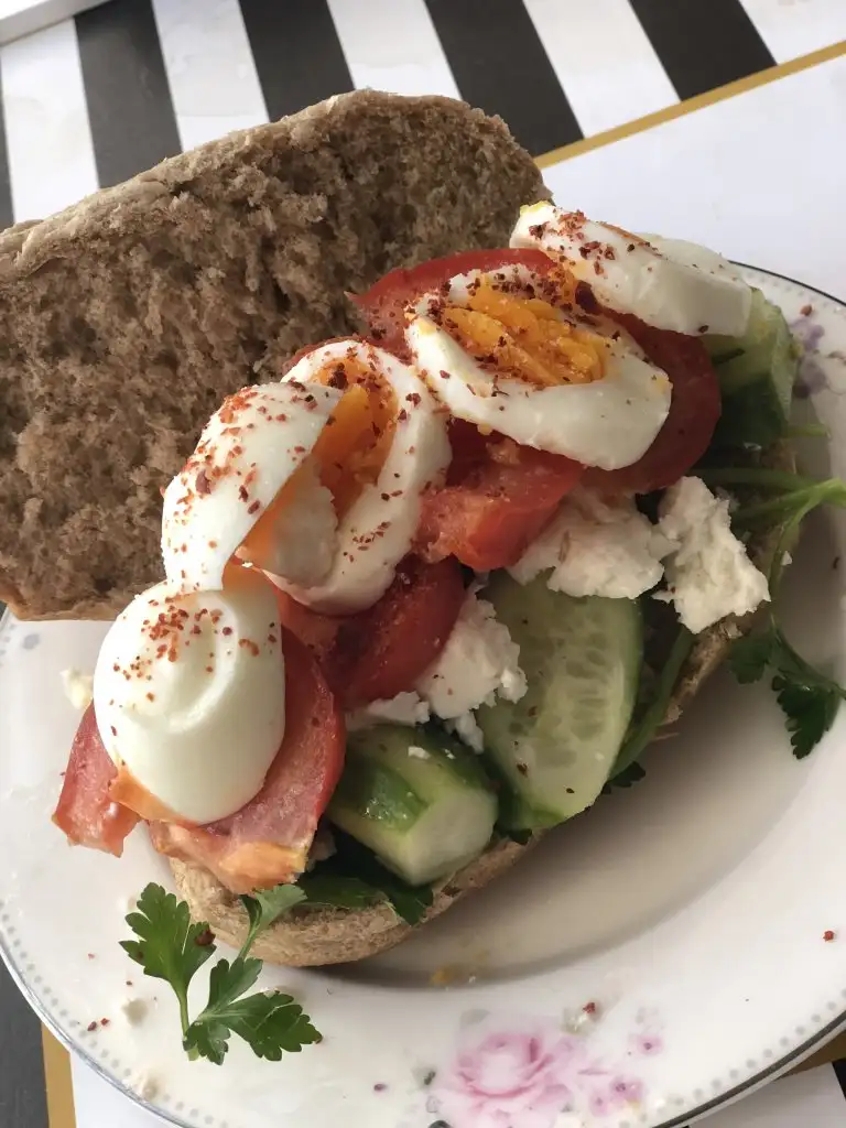 2 haslanmis yumurta peynir salatalik yesillikler zeytin ile klasik kahvalti yaptim