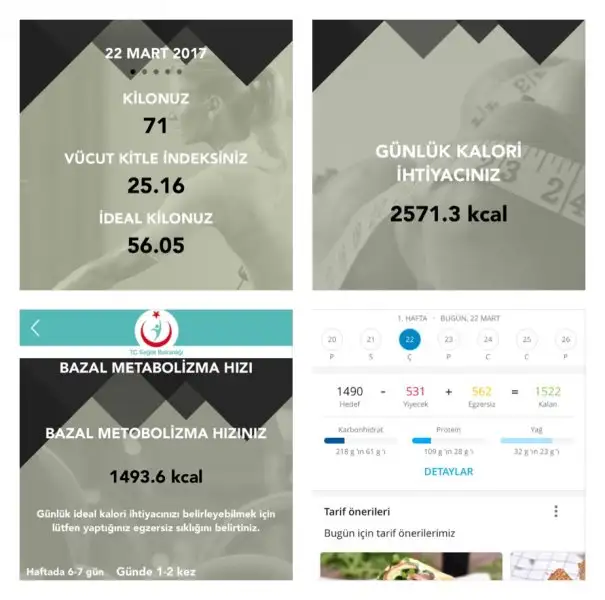 ideal kilonuz 56.5 yaziyo ama boyun 1.68 bence de çok düşük bir kilo boyuna gore nerdeyse boyunla kilon arasında 12.5 kilo var bende programı indirdim sonra sildim orda yazılanları yesem kilo alırım dediğin gibiEki Görüntüle 1971638 Yediklerim 531 kaloriymiş dünküler. Hoş bugün de aynısını yiycem acıkmadım iyiydim çünkü ama 2.500 yemelisin diyor o kadar asla yemem. Kilo alırım. metabolizma hızım 1500 olduğundan 600 spora 500 yemeğe ayırdım. Ama çok mu az acaba 1500 mü yemeliyim. yanlış mı yapıyorum kızlar bi inceleyin. Bişey deyin bana. Tek tek hesapladım yediklerimi. Ne eklesem sağlıklı bari 750 yapayım.