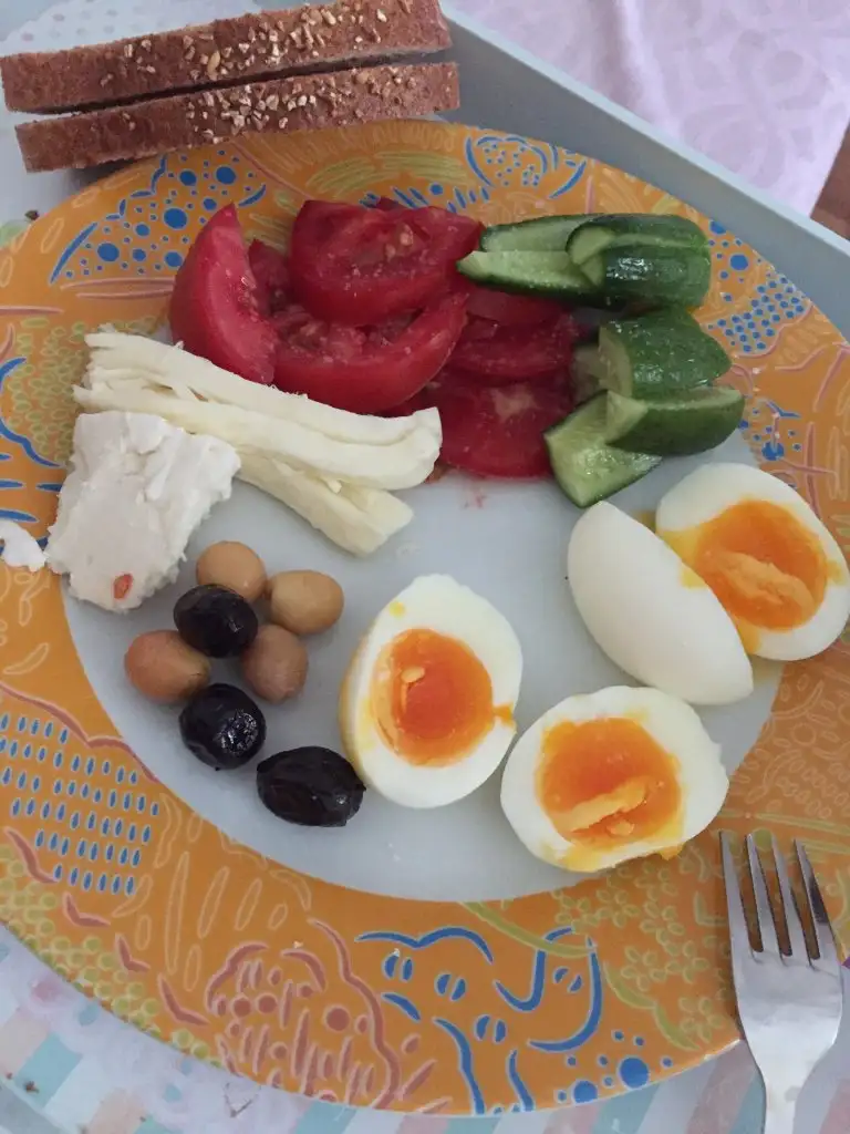 1 yumurta tavada yağsız 1kkpeynir 5zeytin domates 1 dilim kepek ekmek