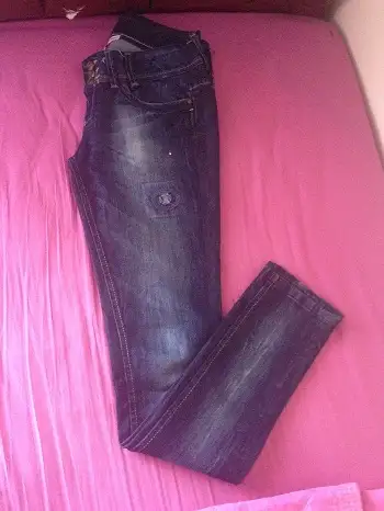 yine taily weijl marka m beden boru paça koyu mavi renkte kot pantolon.kendinden eskitme ve yırtık benzeri şeyleri mevcuttur.çok az kullandım.beli bol geldiği için kullanamıyorum.