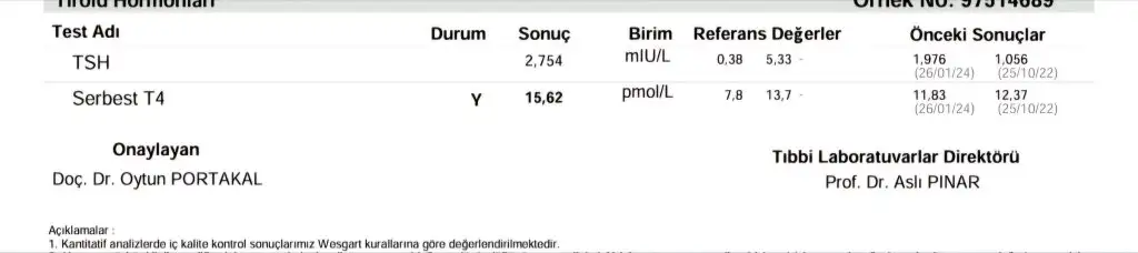 Ekte kizimin bugune dek yapilmis tsh ve t4 testlerinin sonuclariyla referans degerlerini gösteren ekran görüntüsü var.