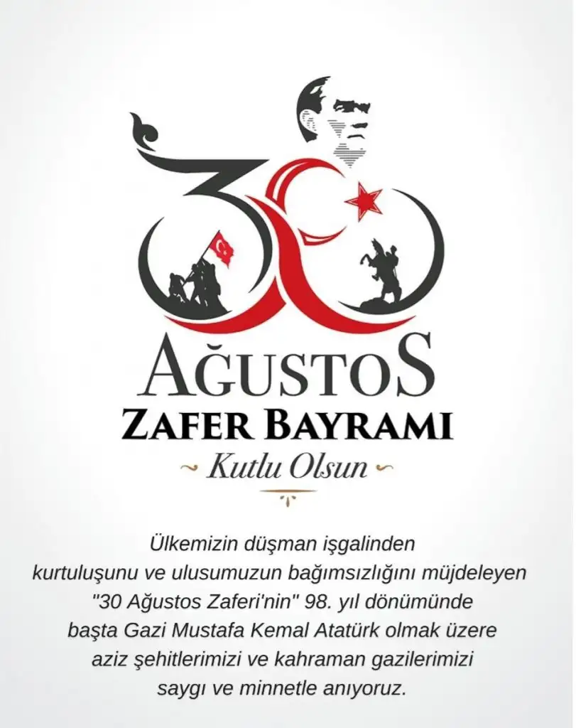 Her aşaması vatanseverlik ve kahramanlık destanlarıyla dolu bu zaferi bize armağan eden başta Gazi Mustafa Kemal Atatürk olmak üzere istiklal mücadelemizin bütün kahramanlarını, aziz şehitlerimizi ve kahraman gazilerimizi rahmet ve minnetle anıyor, 30 Ağustos Zafer Bayramı'nı en içten dileklerimizle kutluyoruz.
